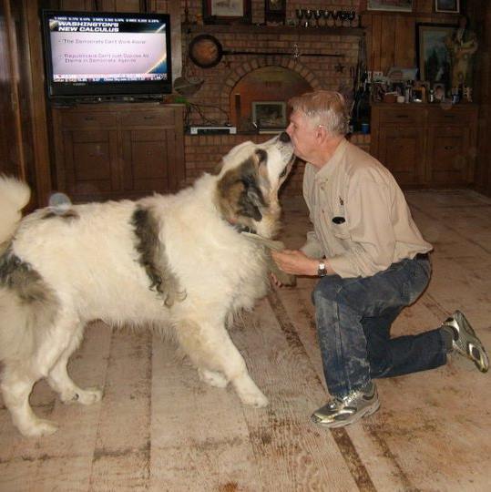 As we wait, I think about the new life this little guy will have, and the joy he is bringing with him.  Dogs have always been a big part of our family.  They have been our companions, our friends, our guards, even our saviors.  Throughout the years there have been 18 furry members of our family.  Queenie, Missy, Token, Tonga, Lady, Sir, Brandy, Boss, Bear, Molly, Preacher, Katya, King, Lucky, Zeus, Cola and Katy.  And Maqua.  To us, they are never just dogs, but true members of our families.  Each was and is well-loved.  We worry about them, care for them,  as if they are our children.  To lose one is to lose a piece of ourselves.  A couple of weeks ago, we lost a huge part of us.  Dad’s gentle giant Maqua couldn’t go on anymore.  His hips were gone, he was in pain, and so with Mom and Dad at his side, he went to wait for us on the rainbow bridge.  His passing left a gaping hole in all our hearts.  Maqua was a Pyrenean Mastiff.  At close to 200 pounds he was the largest dog we’ve ever had.  He was also the gentlest. An ancient breed, Pyrenian Mastiff’s were bred to guard the flocks of sheep against bears and wolves in the Pyrenees Mountains.  They are fierce protectors and yet are extremely gentle with children, and anyone they consider part of their “flock.”  Although not technically a herding dog, Maqua never failed to use his massive head to gently push me wherever he wanted me.  He was Dad’s constant companion for the almost 11 years that he was with us.  Riding in the “dog car” – a Lincoln Aviator so named because it was full of dog hair and drool – the two of them would do everything from going to the grocery store to driving to the lake together.  They shared a couch in the family room, and in his younger days Maqua was not above climbing up and sitting on you if you were foolish enough to sit on his couch.  If you were lucky, occasionally he would bestow a kiss on you.  It always made your heart lighter if you got a Maqua kiss.  With him gone, what would we do?  What would Dad do?  Maqua and Dad
